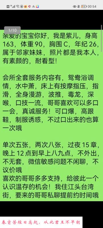 这个我也不知道算不算是避雷贴,毕竟看到很多人推荐这个紫儿,或许他们真的觉得还不错吧,但我个人觉得非常非常一般,首先本身照片就算不上很漂亮,本人就真的要再减掉几分了,身材比较瘦,个人不太喜欢这种类型。然后说到服务,基本上流程是都会走一遍,但是就是很机械式,没什么过多情感,也不太交谈,并且也没有做毒龙,然后容易这不让那不让,不让亲不让舔胸,态度相对冷淡,并没有她描述的那么热情。前戏完了做的时候先是上位弄了一分多钟,然后就躺下要男上,然后大概也就两三分多钟,就说累了,说要我快点射了,这点我就实在很不爽了,一下子没有性质,我就说那我自己用手吧,然后弄快射了说要不射嘴里,又给拒绝了,说好的可口爆,她也没有,莫名其妙搞完了,真的是这几次体验最差了,反正我不知道那些说她好的到底是不是拖,还是要求本来就很低不知道什么样的女的叫漂亮,什么样的服务叫好?那外形,真的四分我的极限了,太瘦了,冲刺毫无感觉。这价位完全有一堆更好选择,今天算是尝鲜翻车