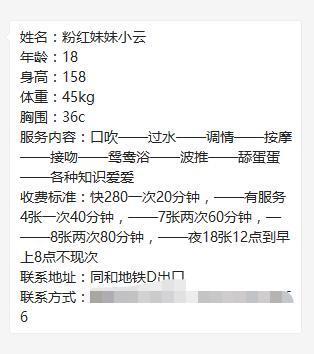 粉嫩优点是年纪小,粉嫩。真实00后,皮肤很滑滑的这种。身高不算高,160这样吧。颜值8分之间。胸大有弹性这种,整个都会跳出来这种。卸货很实在实惠280,真实妹子。刚刚兼职没多久,还是很紧致的。属于小极品了,胸大,又粉嫩。后面来都很带感。每一次都能感觉紧致。各花入各眼睛,喜欢的可以去试试。